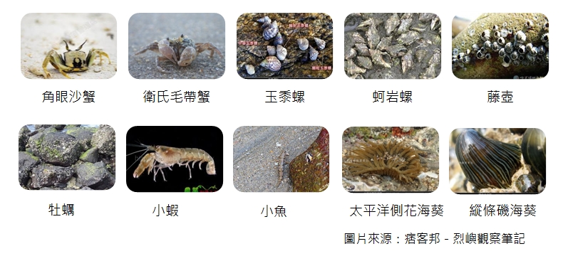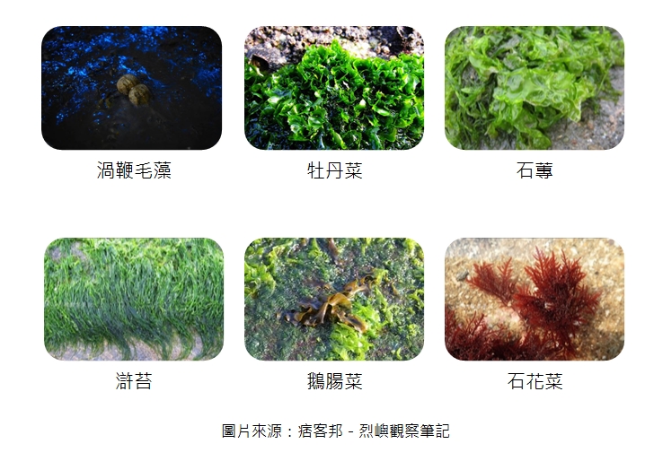 每年3-5月份,海岸邊的「潮溝」(海蝕溝)以石蓴、滸苔等為主的綠色藻類滋長,潮溝水流湍急,溝壁上附著有海棉、管蟲、牡蠣、藤壺、苙螺等潮間帶生物。
